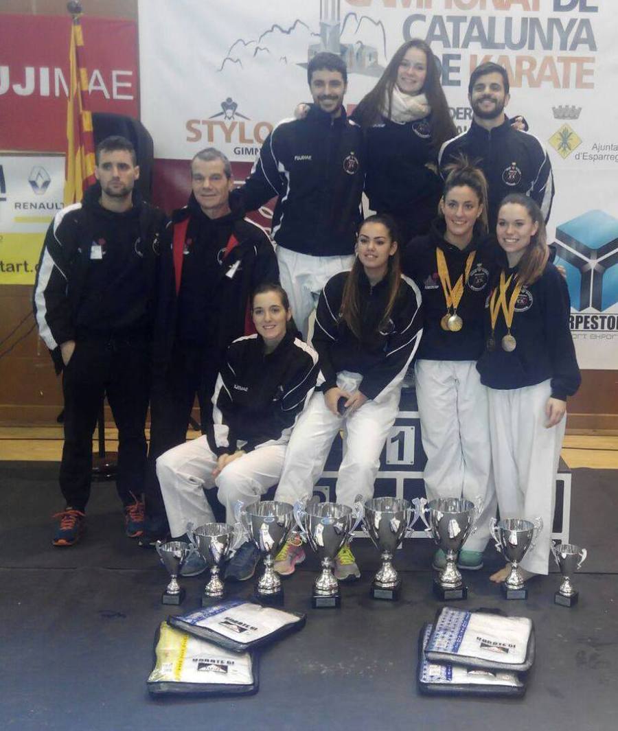 28/01/2017 - El sábado 28 de enero en el pabellón municipal de Esparraguera se disputó el campeonato de Cataluña senior de Karate, competición que aglutina a los mejores Karatecas de Cataluña de las categorías de kata y kumite. De esta competición y de las preselecciones que llevará a cavo la federación catalana de karate saldrán los representantes que participarán el próximo 11 de marzo en el Campeonato de España senior, por lo que nuestros competidores viajaron muy concentrados y a sabiendas de lo mucho que se disputaban en este campeonato. Todo esto lo pudieron demostrar a lo largo de la mañana y la recompensa fueron los resultados, ya que el club se presentaba con siete competidores los cuales consiguieron ocho medallas, cuatro campeonatos, dos subcampeonatos y dos terceros. Destacamos el campeonato realizado por María López y Naiara Moreno, las cuales obtuvieron dos campeonatos de Cataluña cada una de ellas.