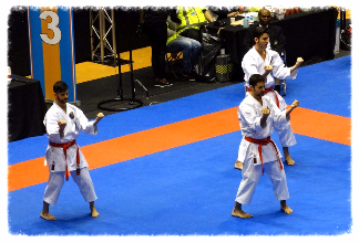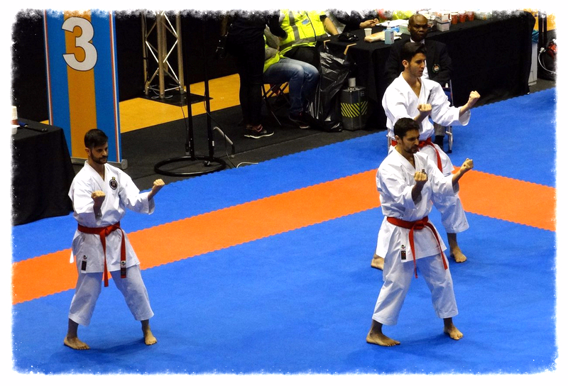 En katas los equipos están formados por 3 karatekas que tienen que coordinar sus movimientos durante la ejecución del ejercicio, además en las rondas donde están en juego las medallas, los equipos tienen que realizar un bunkai, que es la aplicación real de las técnicas exhibidas en el kata. Esta parte de la competición es de las más esperadas y espectaculares.